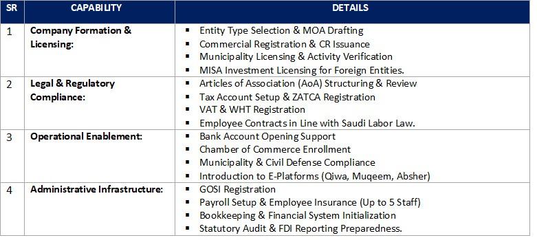 Enterprise Business Management Solutions COE, PMO, VMO Complete set up, Governance Framework and Compliance Administrative Compliance Support for SMEs Company Formation in Saudi Arabia Business Enablement program: